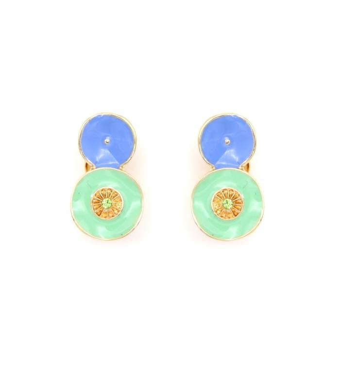 Hoe stijl je een frisse look met subtiele speelsheid? Deze oorclips combineren mintgroen met lavendelblauw in een glanzend, rond design. Het gouden midden accent met groen steentje maakt het geheel retro, maar toch eigentijds. Perfect voor een winterse of kleurrijke outfit. Vrolijke oorclips Lichtgewicht kunststof en zachte rubbertjes zorgen voor optimaal draagcomfort. Deze oorbellen zijn een stijlvolle aanvulling op elke sieradencollectie, ideaal voor wie houdt van kleur, zonder te overdrijven.