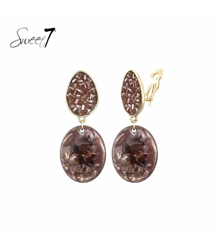 Deze bruine oorclips vormen de perfecte balans tussen natuurlijke tinten en een stijlvolle uitstraling. De ovale hanger heeft een marmerachtige glans, terwijl de bovenkant is bezet met glinsterende glas stukjes. Ideaal voor wie op zoek is naar fashion oorbellen met een warme, elegante touch. Comfort zonder gaatjes Dankzij de zachte rubbertjes blijven deze oorclips stevig en comfortabel zitten. De goudkleurige afwerking maakt ze makkelijk te combineren met andere sieraden. Een subtiele statement voor elke dag of een casual avondje uit.