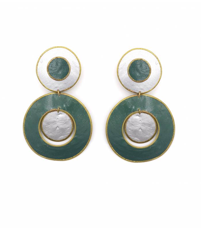 Deze oorclips combineren donkergroen en zilver in een opvallend cirkelontwerp met gouden accenten. De dubbele schijven creeren een speels 70s effect dat direct de aandacht trekt. Ideaal voor wie houdt van vintage flair met een moderne twist. Perfect voor feest, festival of fashion statement. Tijdloos met een twist De matte afwerking en lichte materialen maken deze oorclips comfortabel om te dragen, zonder in te leveren op stijl. De metallic tinten geven een subtiele glamour touch aan je outfit. Combineer met neutrale basics of ga all in met kleur. Deze oorbellen doen het allebei.